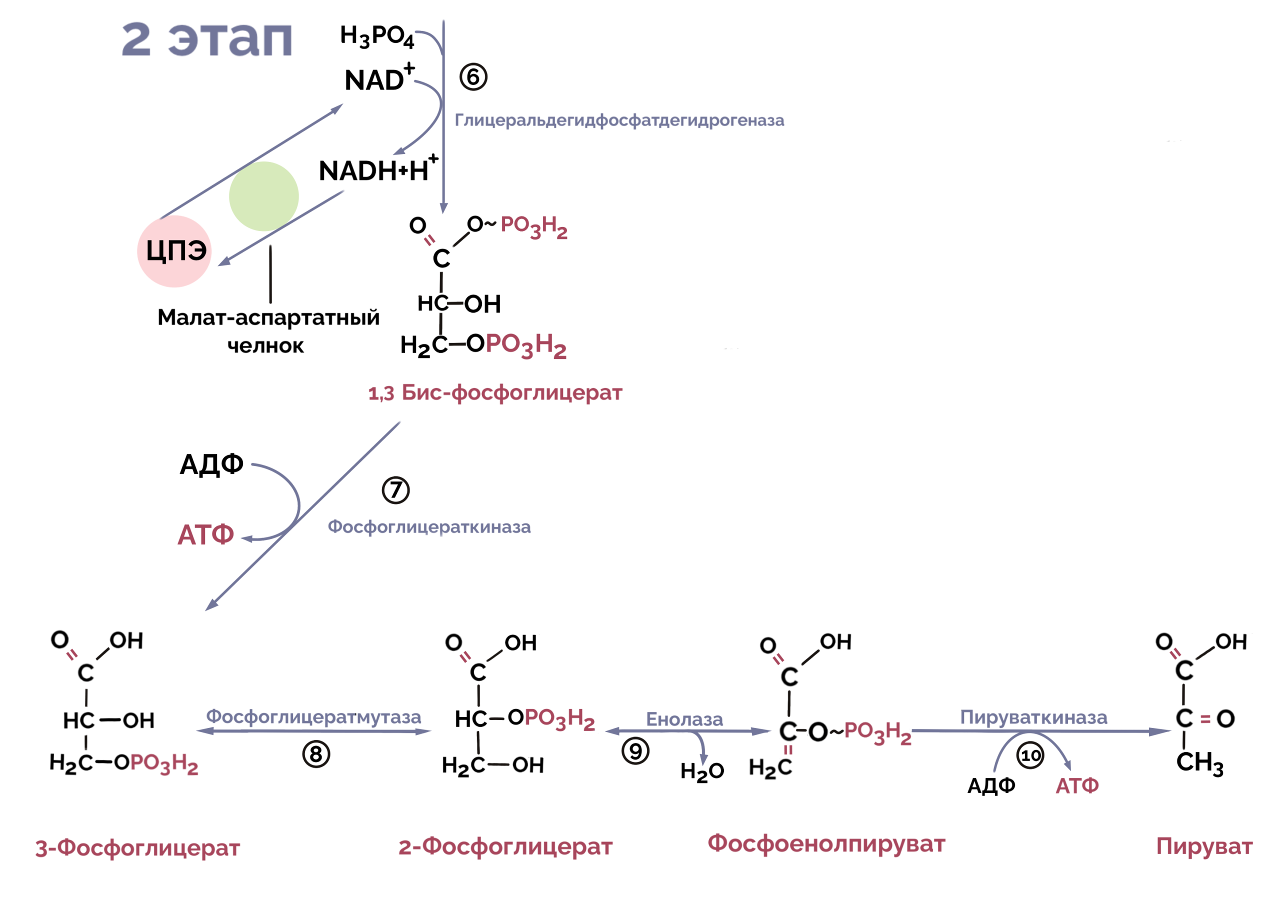 - Дегидратация: 2-фосфоглицерат дегидратируется с образованием фосфоенолпирувата.